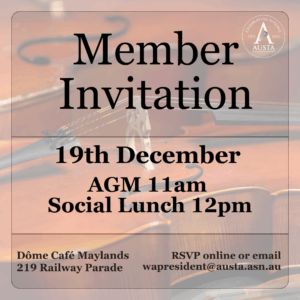 In addition to the AUSTA WA Facebook page, (which is largely for AUSTA events, member news and opportunities posted by AUSTA Social Media managers) we have started a page AUSTA WA Group which is for members of the group and others to post freely in regard to anything of interest to the string community. All responsibility lies with those who post and is not the responsibility of AUSTA WA.