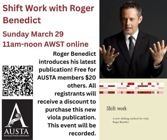 A generous discount code for purchasing the physical book “Shift Work for Viola” AND Roger’s other publication on technique, “Scale Up!”, will be sent to all who register, a total value of over $24!