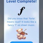 These flashcard levels remain a core component of both apps, in addition to the many features that have been added since (String Position Pro ventures into other positions and is designed for an older audience). In String Note Tutor, most flashcard levels introduce something new, and there are revision levels dotted throughout. In these revision levels, a simple algorithm keeps track of incorrect answers for that session to display them more frequently. Progression through levels is based on consecutive correct answers, to ensure that the content is thoroughly known before moving on. However, access to all levels is unrestricted, so it’s straightforward for students to select the most relevant level for their stage of learning. A high-quality recording of the note is played for each correct answer, and a humorous sound plays, along with clear feedback, when an error is made. At the end of each level, a unique teddy bear appears with a level-appropriate ‘fun fact’ about music or string playing.